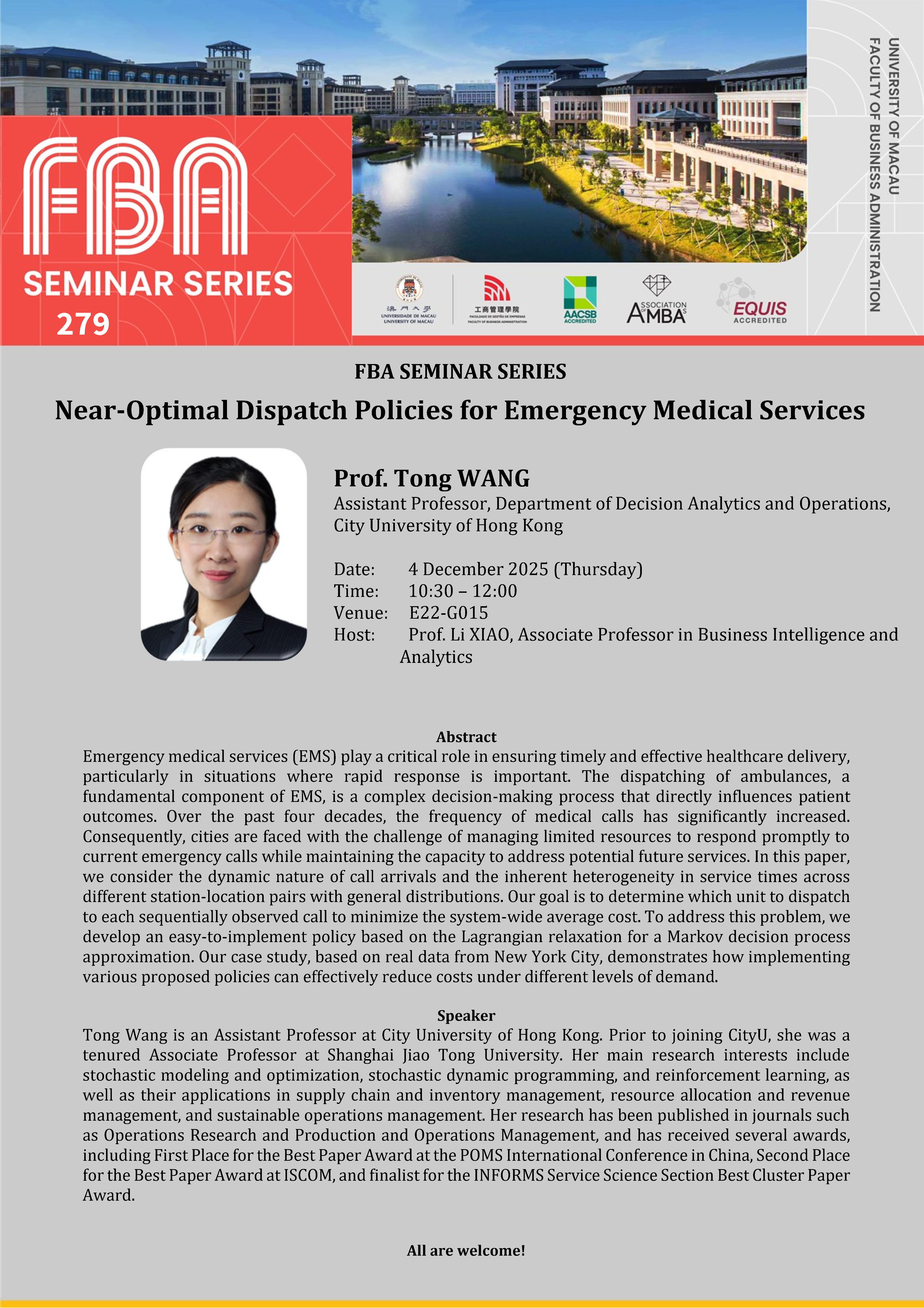 FBA Seminar Series: “Near-Optimal Dispatch Policies for Emergency Medical Services” by Prof. Tong WANG
