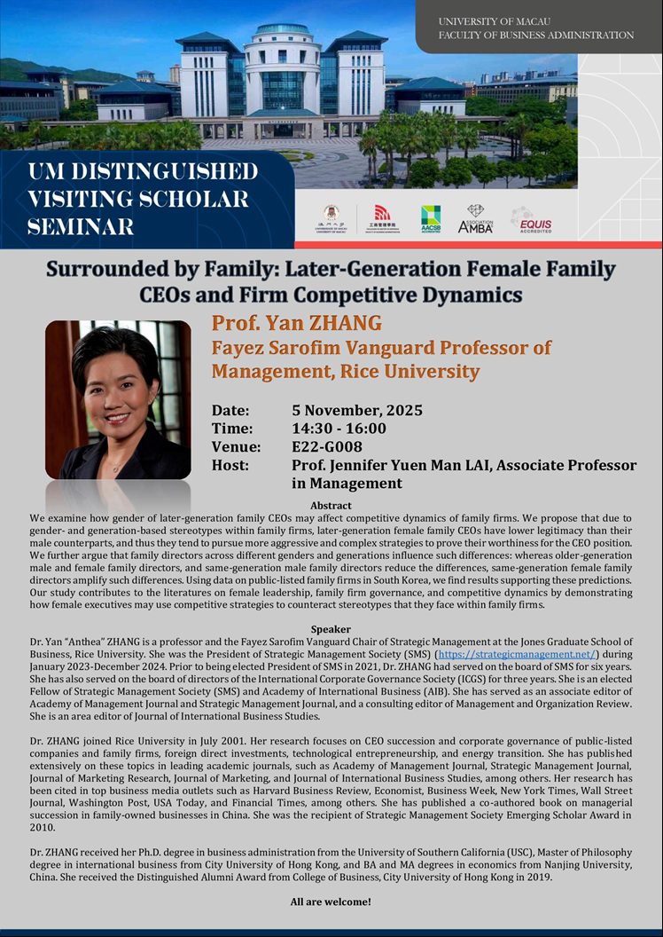 UM Distinguished Visiting Scholar Seminar “Surrounded by Family: Later-Generation Female Family CEOs and Firm Competitive Dynamics” by Prof. Yan ZHANG GalleryUM Distinguished Visiting Scholar Seminar “Surrounded by Family: Later-Generation Female Family CEOs and Firm Competitive Dynamics” by Prof. Yan ZHANG