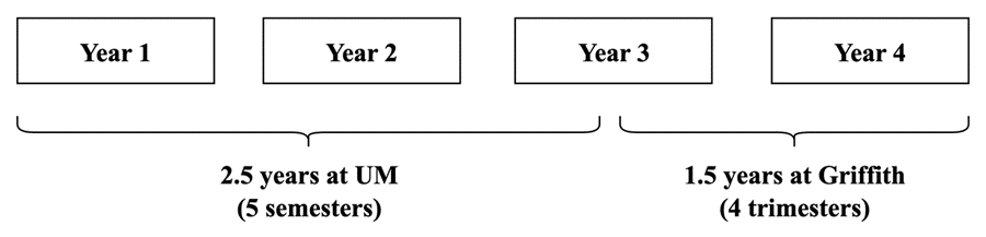 Duration Under the programme, registered UM Students will spend five semesters studying at UM, followed by four trimesters studying at Griffith. Each academic year consists of two semesters at UM and three trimesters at Griffith .