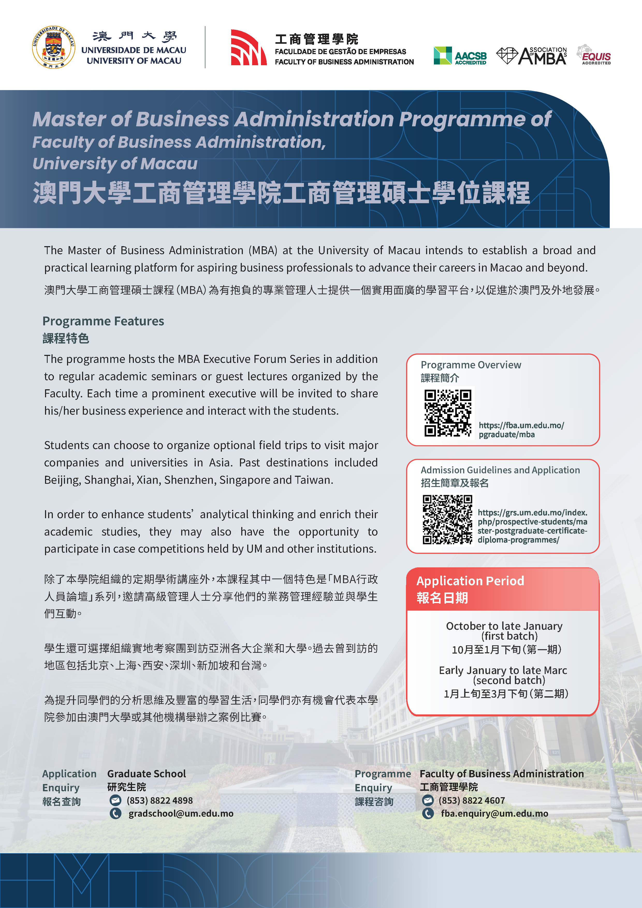 準備好在您的事業中更進一步了嗎? 工商管理碩士課程(MBA)獲得工商管理碩士協會(AMBA)認證,提供充滿活力的學習體驗,旨在幫助您取得成功。 您將透過「MBA行政人員論壇」系列與業界領袖互動、獲取寶貴見解,並透過考察團和客席講座受益於實務學習。 歡迎有意人士請於2026年3月13日前申請!