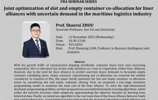 FBA Seminar Series: “Joint optimization of slot and empty container co-allocation for liner alliances with uncertain demand in the maritime logistics industry” by Prof. Shaorui ZHOU