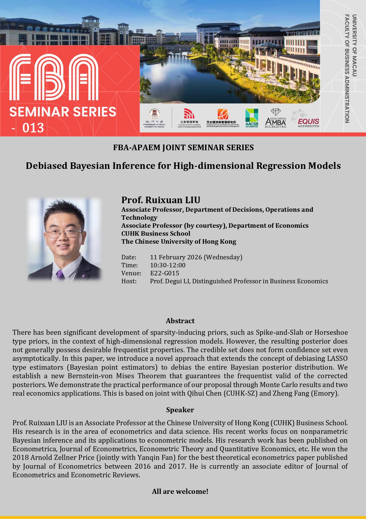 FBA-APAEM Joint Seminar Series: “Debiased Bayesian Inference for High-dimensional Regression Models” by Prof. Ruixuan LIU