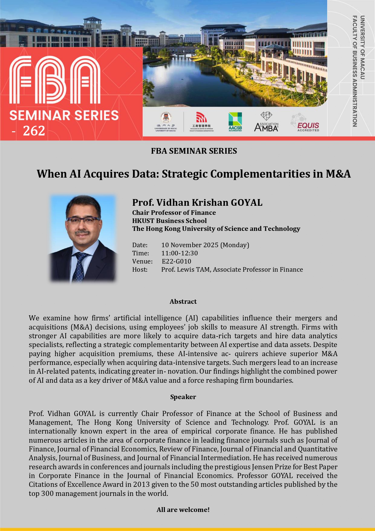 FBA Seminar Series: “When AI Acquires Data: Strategic Complementarities in M&A” by Prof. Vidhan Krishan GOYAL