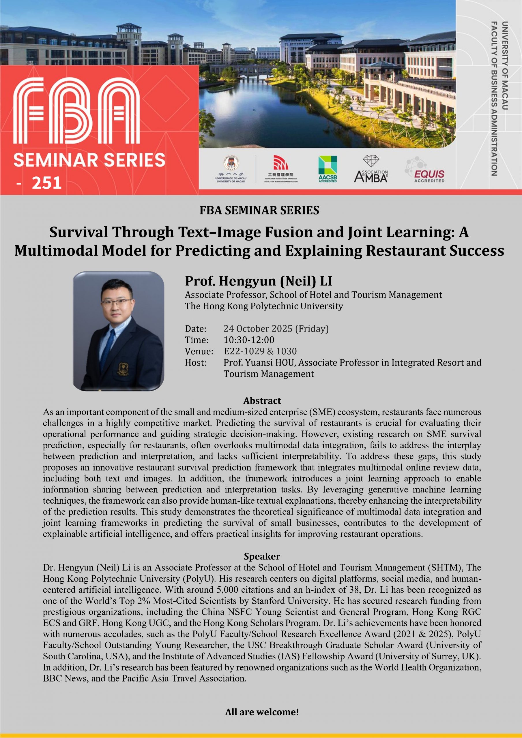 FBA Seminar Series: “Survival Through Text–Image Fusion and Joint Learning: A Multimodal Model for Predicting and Explaining Restaurant Success” by Prof. Hengyun (Neil) LI