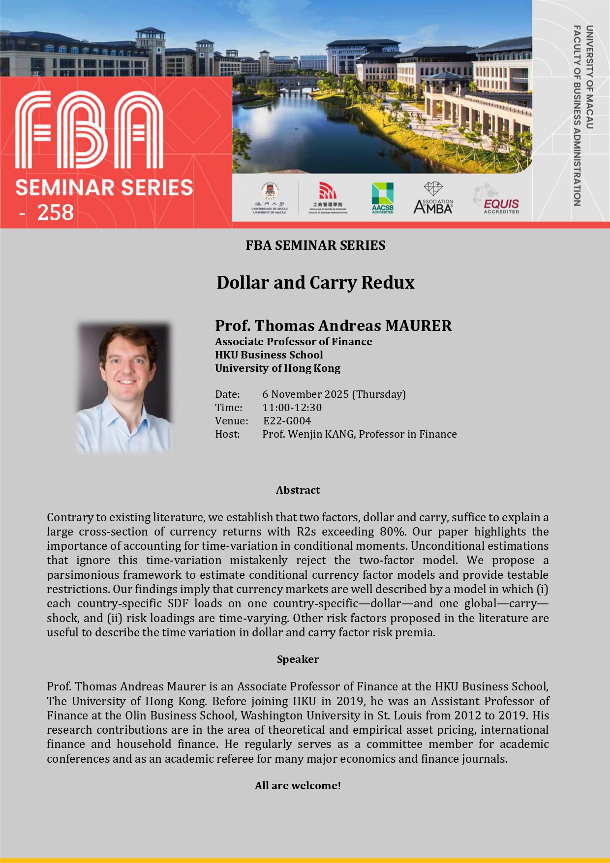FBA Seminar Series: “Dollar and Carry Redux” by Prof. Thomas Andreas MAURER