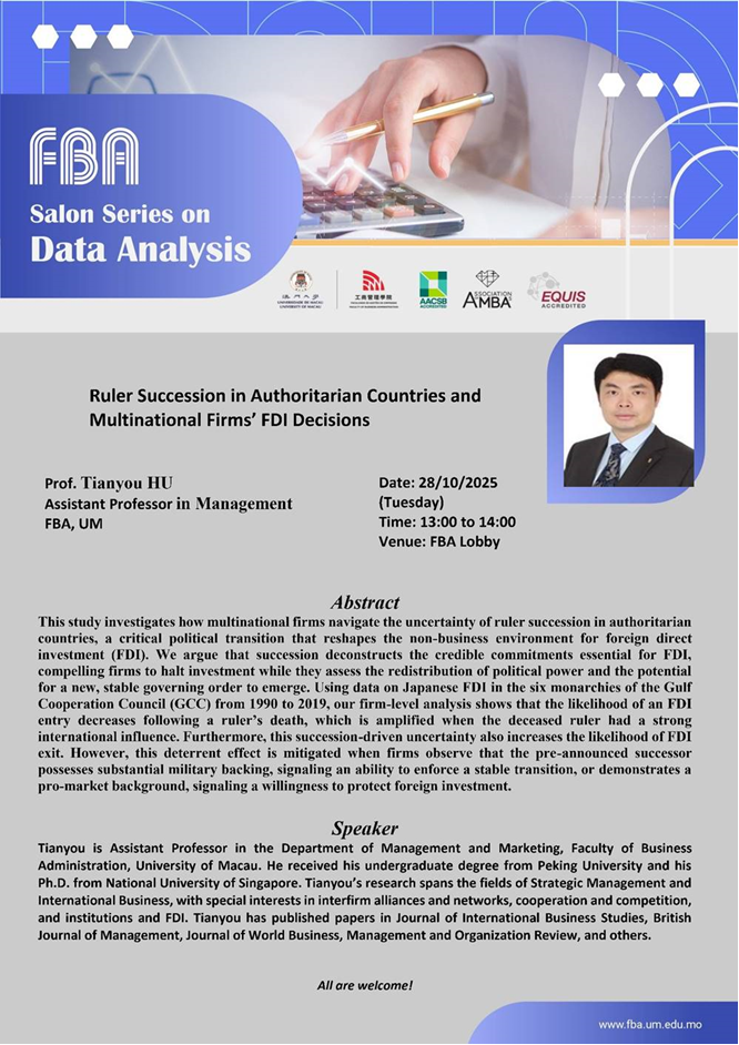 This study investigates how multinational firms navigate the uncertainty of ruler succession in authoritarian countries, a critical political transition that reshapes the non-business environment for foreign direct investment (FDI). We argue that succession deconstructs the credible commitments essential for FDI, compelling firms to halt investment while they assess the redistribution of political power and the potential for a new, stable governing order to emerge. Using data on Japanese FDI in the six monarchies of the Gulf Cooperation Council (GCC) from 1990 to 2019, our firm-level analysis shows that the likelihood of an FDI entry decreases following a ruler’s death, which is amplified when the deceased ruler had a strong international influence. Furthermore, this succession-driven uncertainty also increases the likelihood of FDI exit. However, this deterrent effect is mitigated when firms observe that the pre-announced successor possesses substantial military backing, signaling an ability to enforce a stable transition, or demonstrates a pro-market background, signaling a willingness to protect foreign investment.